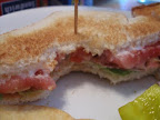 Thank you for your thoughtful, if terse, compliment on my first submission in you BLT contest. I’d refer to it here to refresh my reader’s memories, but in a senior moment I overwrote the original post. But in pictures it still lives! That vile concoction of pre-cooked bacon, bagged iceberg, pink imported tomato, and Miracle Whip. Served with Lays Stax™ potato “crips” and Vlasic® “Kosher Dill” spears it was a delight only the American palate could appreciate! You can see a slideshow by clicking the photo at right.