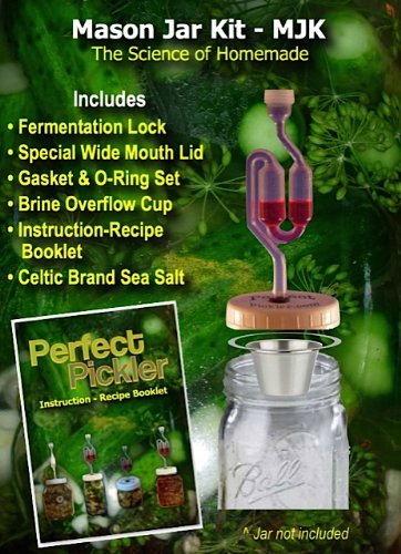 The kit contains a plastic top which will fit a wide mouth Mason jar. Mounted in the top is a water airlock, and also a gasket inside the top to maintain a good seal. There is a small overflow cup which resembles nothing more than a metal shot glass. Also included in the kit are directions, and a bag of Celtic Sea Salt.