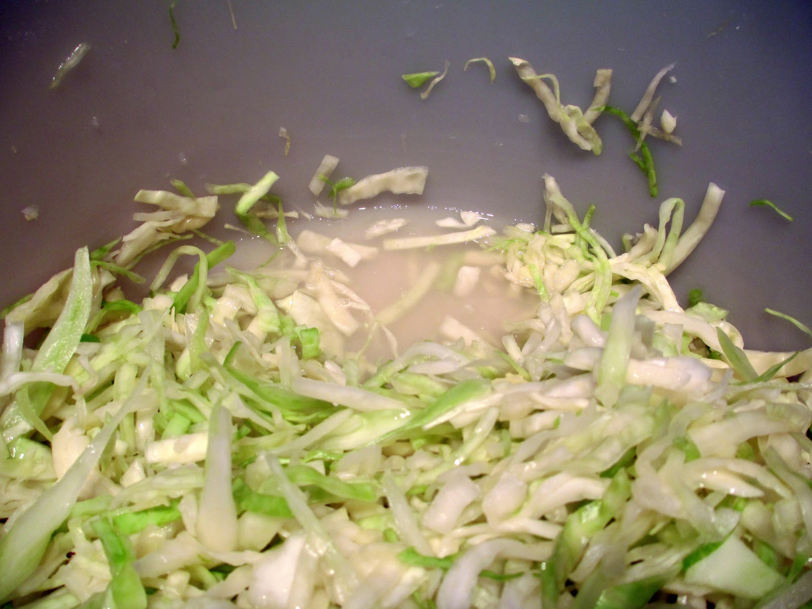 About a tablespoon of salt is sprinkled over and mixed with the shredded cabbage. It is allowed to stand for several hours or overnight. I tend to place it in a bowl and put a plate on top of it that fits inside the bowl weighting it down with Mason jars filled with water. Overnight is best.