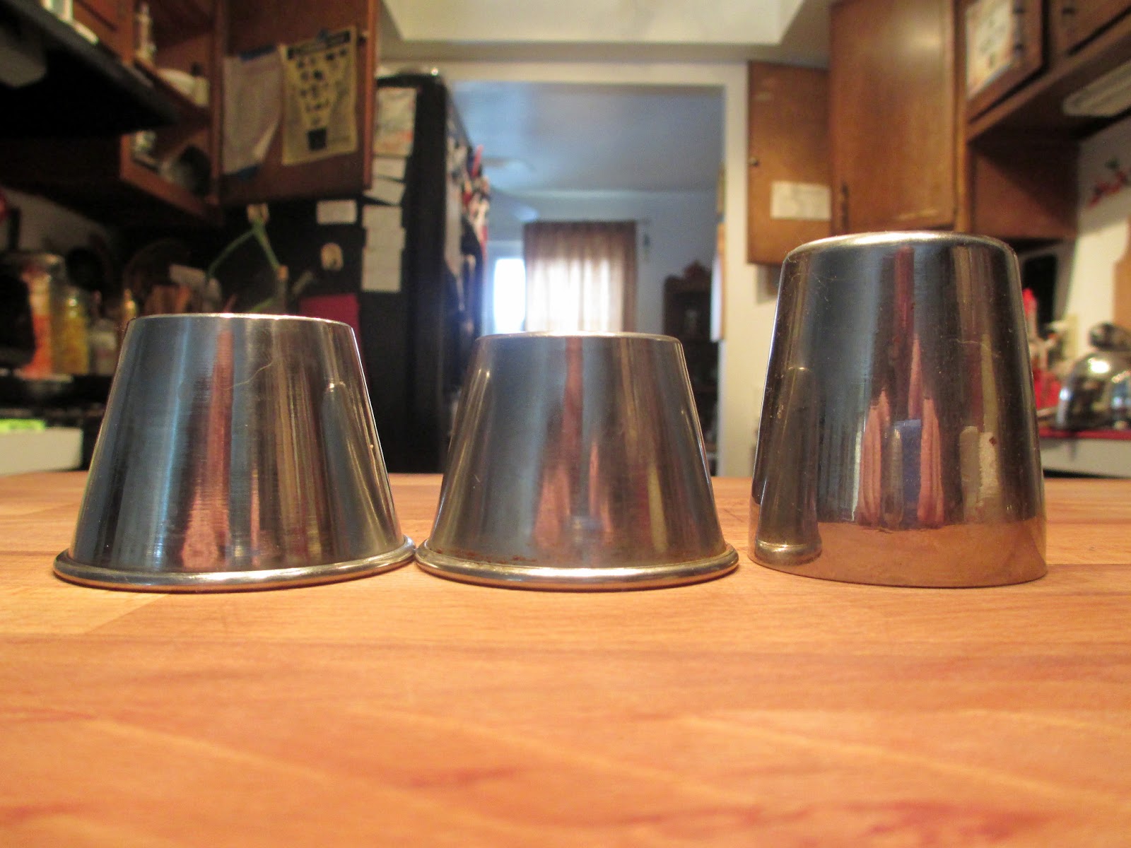 As for the overflow cup, it really does look like a shot glass. I have used one as a substitute. I have also used the top from a metal cocktail shaker. I picked up a set of stainless steel prep cups at T.J. Marshall’s, complete with plastic lids, which are almost indistinguishable from the Pickler cup. Can you tell them apart? About a buck and a quarter a pop for reusable prep cup.