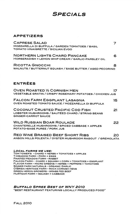 I think I may have briefly met Carmelo Raimondi at the Farmer/Chef conference last January, but I really have wanted to go to his restaurant for a while (like Steven, Carmelo lists his local producers on the menu). We even overcame our fear of Niagara County water.