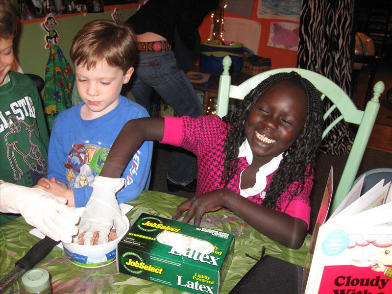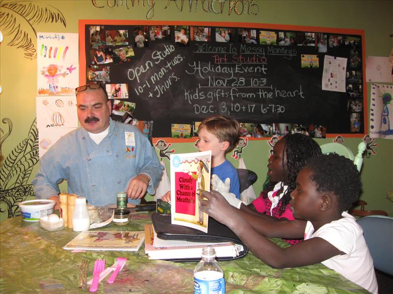 Yesterday was my first regular gig at Monkey See, Monkey Do, a bookstore steered toward kids in Clarence. We did a reading of Cloudy With a Chance of Meatballs by Judi and Ron Barrett. We squished the ingredients, and and ate some meatballs in tomato sauce that I had made earlier in the day.