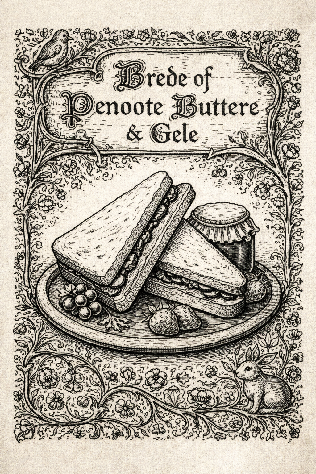 Take after gelé of fruyt—of grape, or of strawberye, or other swete conserue—and laye it upon the tother brede, but with mesure and courtly restraint, that it flee not upon thy fingers like a villeyn escaped.