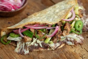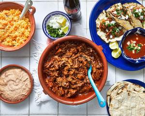 of a blender, add rehydrated guajillos, plus a couple tablespoons from