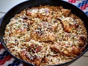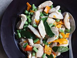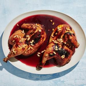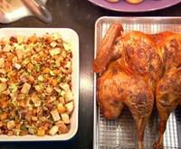 chicken (skin side up) and vegetables on sheet pan. Push vegetables to